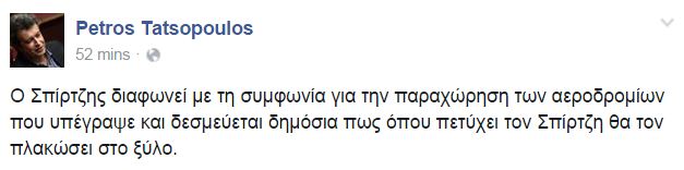 Ο Πέτρος Τατσόπουλος, σχολίασε στον προσωπικό του λογαριασμό στο Facebook σχολίασε τα όσα είπε ο υπουργός Μεταφορών, Χρήστος Σπίρτζης για την συμφωνία παραχώρησης των αεροδρομίων.