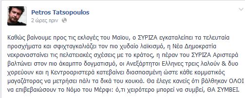 Ο Πέτρος Τατσόπουλος έκανε ένα σχόλιο στο Facebook ενόψει των εκλογών, στο οποίο μεταξύ  άλλων ήταν ιδιαίτερα επικριτικός με τον ΣΥΡΙΖΑ.