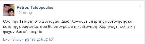 Τη μεγάλη συγκέντρωση που είναι προγραμματισμένη για την Τετάρτη, κατά της λιτότητας, σχολίασε μέσω του προσωπικού του λογαριασμού στο Facebook, ο πρώην βουλευτής, Πέτρος Τατσόπουλος.
