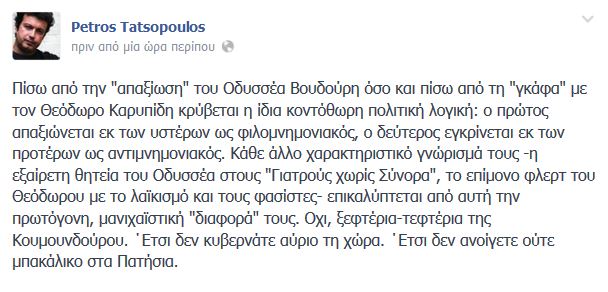 “Πίσω από την “απαξίωση” του Οδυσσέα Βουδούρη όσο και πίσω από τη “γκάφα” με τον Θεόδωρο Καρυπίδη κρύβεται η ίδια κοντόθωρη πολιτική λογική: ο πρώτος απαξιώνεται εκ των υστέρων ως φιλομνημονιακός, ο δεύτερος εγκρίνεται εκ των προτέρων ως αντιμνημονιακός. Κάθε άλλο χαρακτηριστικό γνώρισμά τους -η εξαίρετη θητεία του Οδυσσέα στους “Γιατρούς χωρίς Σύνορα”, το επίμονο φλερτ του Θεόδωρου με το λαϊκισμό και τους φασίστες- επικαλύπτεται από αυτή την πρωτόγονη, μανιχαϊστική “διαφορά” τους. Οχι, ξεφτέρια-τεφτέρια της Κουμουνδούρου. ΄Ετσι δεν κυβερνάτε αύριο τη χώρα. ΄Ετσι δεν ανοίγετε ούτε μπακάλικο στα Πατήσια” έγραψε ο κ. Τατσόπουλος στη σελίδα του στο Facebook.
