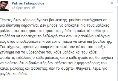 Απάντηση για την «ιδιότυπη καραντίνα» στην οποία μπαίνουν, όπως υποστηρίζει, οι εκλεγμένοι πολιτικοί έδωσε ο βουλευτής του ΣΥΡΙΖΑ Πέτρος Τατσόπουλος, τονίζοντας ότι η πολιτική ορθότητα τους επιβάλλει να προσέχουν το λεξιλόγιό τους σαν… Ουρσουλίνες καλόγριες.Διαβάστε το σχόλιο του Πέτρου Τατσόπουλου στη σελίδα του στο Facebook: