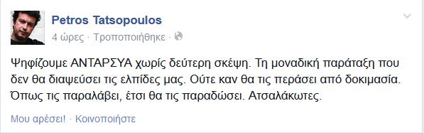“Ψηφίζουμε ΑΝΤΑΡΣΥΑ χωρίς δεύτερη σκέψη. Τη μοναδική παράταξη που δεν θα διαψεύσει τις ελπίδες μας. Ούτε καν θα τις περάσει από δοκιμασία. Όπως τις παραλάβει, έτσι θα τις παραδώσει. Ατσαλάκωτες”, έγραψε ο ανεξάρτητος βουλευτής Πέτρος Τατσόπουλος στο προφίλ του στο Facebook κάνοντας προφανώς… χιούμορ.