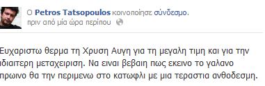 “Ευχαριστώ θερμά τη Χρυσή Αυγή για τη μεγάλη τιμή και για την ιδιαίτερη μεταχείριση. Να είναι βέβαιη πως εκείνο το γαλανό πρωινό θα την περιμένω στο κατώφλι με μια τεράστια ανθοδέσμη”, ήταν το σχόλιο που έκανε ο βουλευτής του ΣΥΡΙΖΑ στην προσωπική του σελίδα στο Facebook.