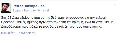 Λίγο μετά την ανακοίνωση της ημερομηνίας για την προεδρική εκλογή ο ανεξάρτητος βουλευτής Πέτρος Τατσόπουλος έγραψε στο Facebook: