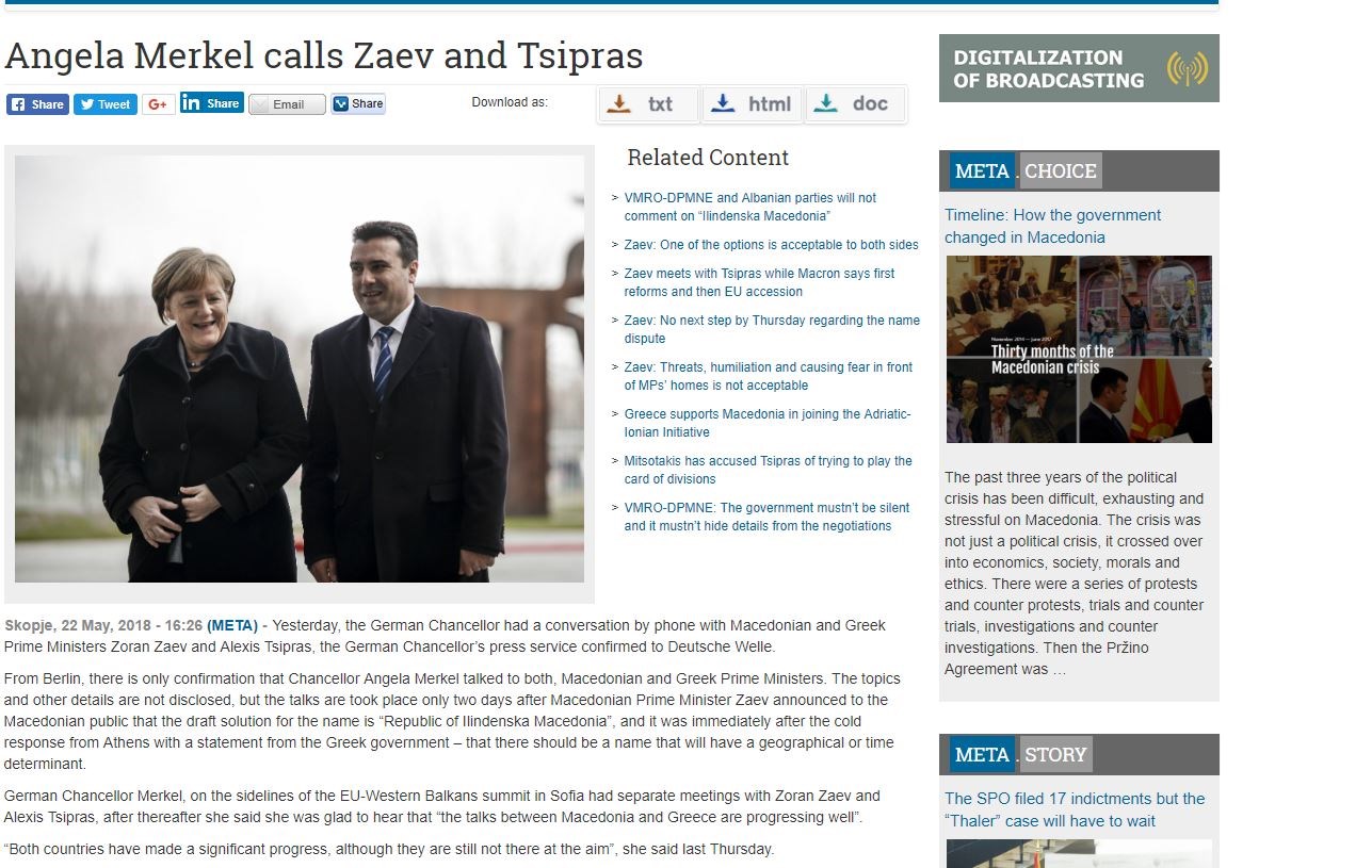 Ωστόσο, δεν έγιναν γνωστές λεπτομέρειες για το περιεχόμενο των συνομιλίων. Από την άλλη μόνο τυχαίο δεν θεωρείται το γεγονός ότι αυτές οι επικοινωνίες πραγματοποιούνται δύο μέρες μετά τθις δηλώσεις του Ζόραν Ζάεφ για την ονομασία «Δημοκρατία της Μακεδονίας του Ίλιντεν», τόσο από την ελληνική, όσο και από την σκοπιανή πλευρά.