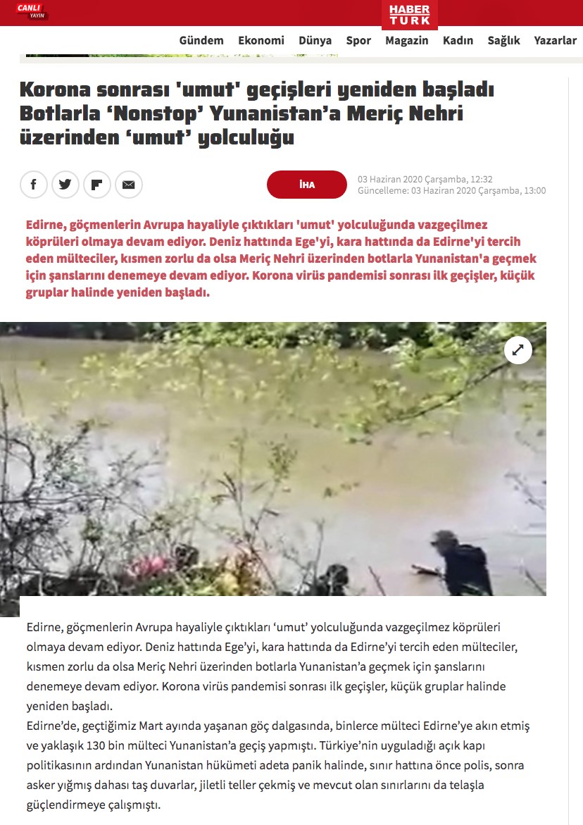 Σύγχυση, ωστόσο, επιχειρεί να προκαλέσει δημοσίευμα – με ψεύτικα στοιχεία – της τουρκικής ιστοσελίδας Haber Turk, η οποία αναφέρει ότι «τώρα που πέρασε η απειλή του covid 19 έχουν αρχίσει και συγκεντρώνονται χιλιάδες πρόσφυγες και μετανάστες στα σύνορα με την Ελλάδα, οι οποίοι με βάρκες επιθυμούν να περάσουν τον Έβρο για να βρεθούν στην Ευρώπη». Μάλιστα, το δημοσίευμα αναφέρεται και στα γεγονότα του περασμένου Μαρτίου, οπότε πέρασαν όπως λέει «τα σύνορα 130.000 πρόσφυγες και μετανάστες» ενώ σε άλλο σημείο επισημαίνει ότι «κατά την διάρκεια των ταραχών που ξέσπασαν σκοτώθηκαν 3 άτομα και τραυματίστηκαν εκατοντάδες».