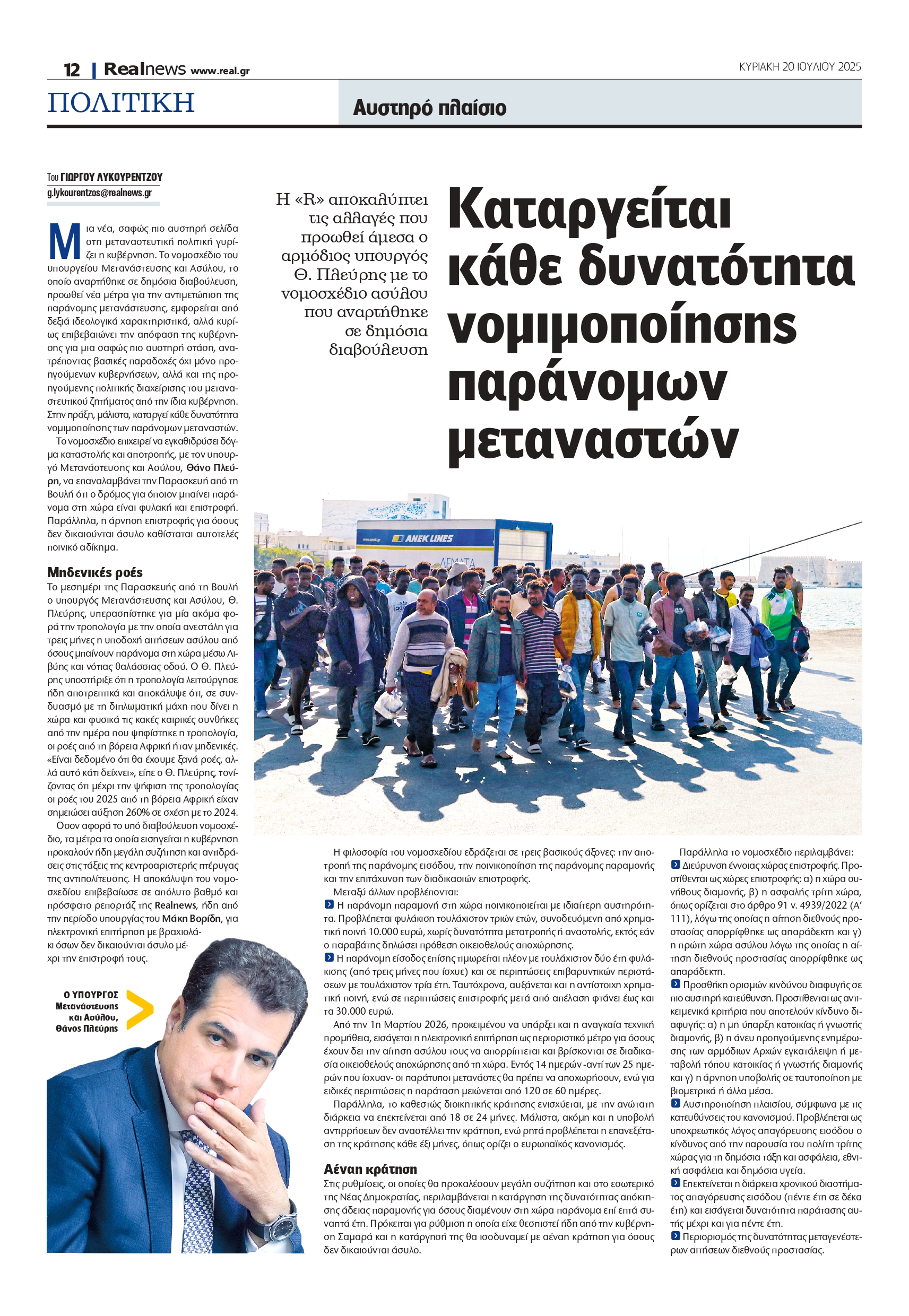 «Είναι δεδομένο ότι θα έχουμε ξανά ροές, αλλά αυτό κάτι δείχνει», είπε ο Θ. Πλεύρης, τονίζοντας ότι μέχρι την ψήφιση της τροπολογίας οι ροές του 2025 από τη βόρεια Αφρική είχαν σημειώσει αύξηση 260% σε σχέση με το 2024. Όσον αφορά το υπό διαβούλευση νομοσχέδιο, τα μέτρα τα οποία εισηγείται η κυβέρνηση προκαλούν ήδη μεγάλη συζήτηση και αντιδράσεις στις τάξεις της κεντροαριστερής πτέρυγας της αντιπολίτευσης. Η αποκάλυψη του νομοσχεδίου επιβεβαίωσε σε απόλυτο βαθμό και πρόσφατο ρεπορτάζ της Realnews, ήδη από την περίοδο υπουργίας του Μάκη Βορίδη, για ηλεκτρονική επιτήρηση με βραχιολάκι όσων δεν δικαιούνται άσυλο μέχρι την επιστροφή τους.