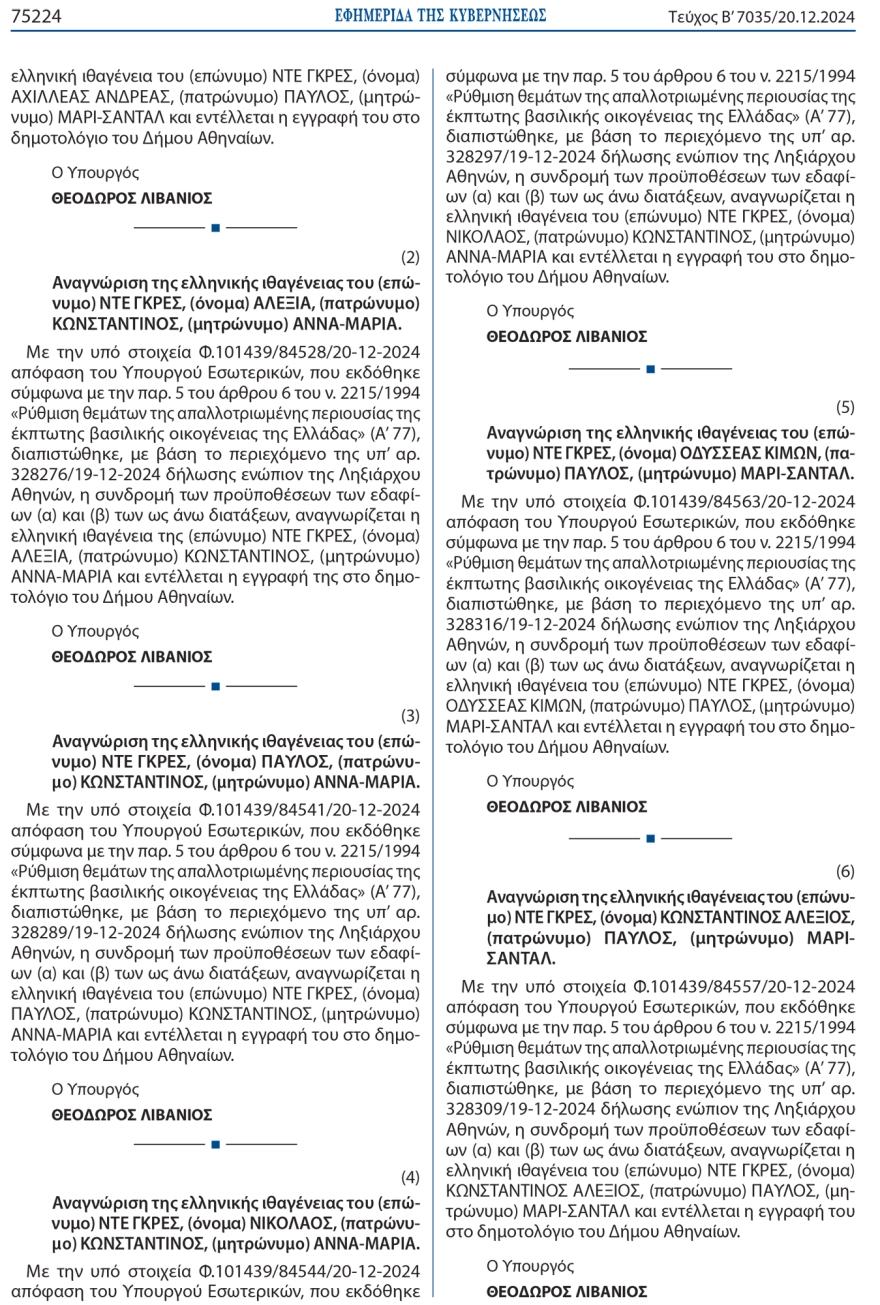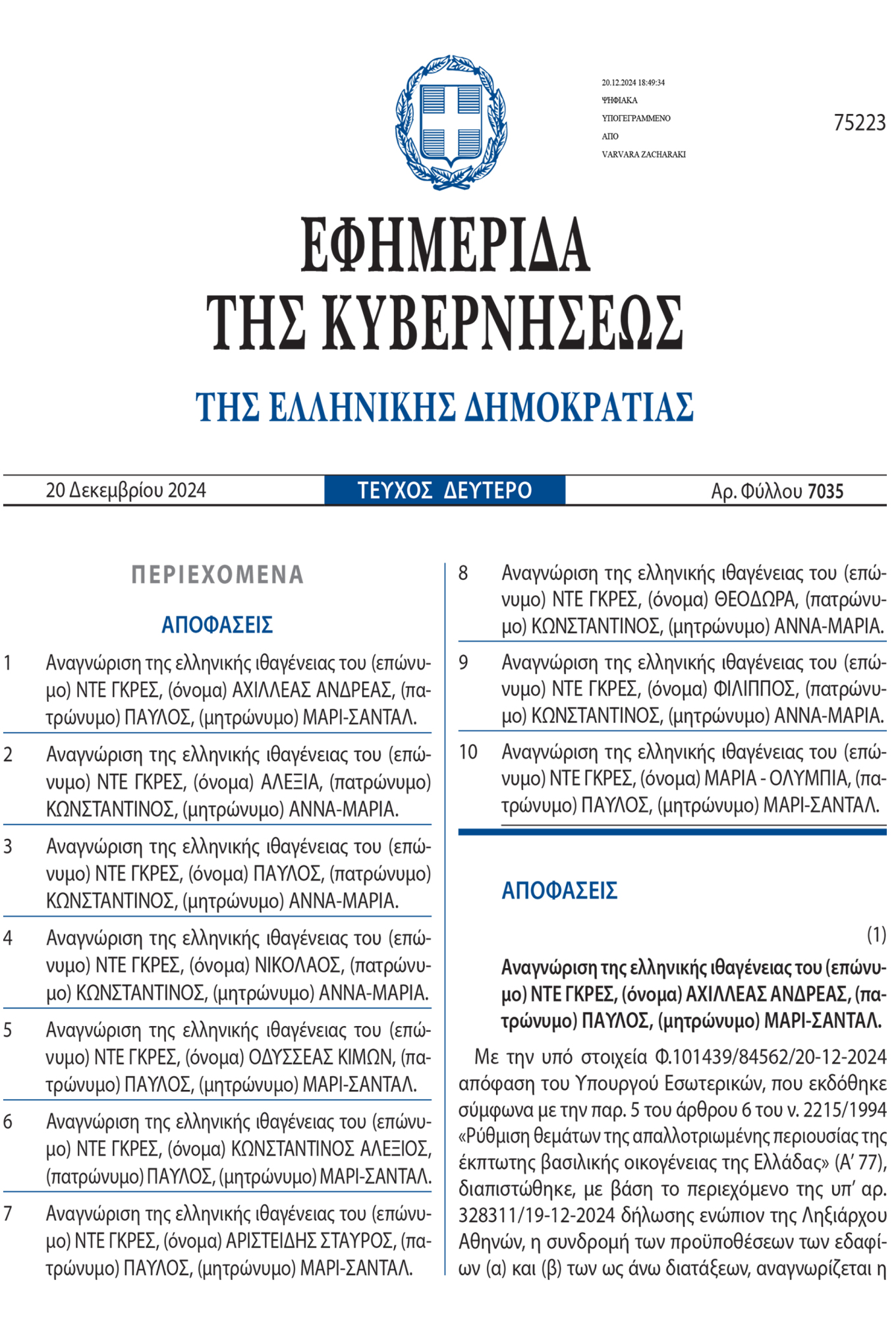 Δημοσιεύτηκαν σε ΦΕΚ οι 10 διαπιστωτικές πράξεις για τα μέλη της τέως βασιλικής οικογένειας και προωθήθηκαν στο ληξιαρχείο Αθηνών προκειμένου να ολοκληρωθεί η διαδικασία για την απόκτηση ελληνικής ιθαγένειας, έπειτα από σχετικό αίτημα που κατέθεσαν.