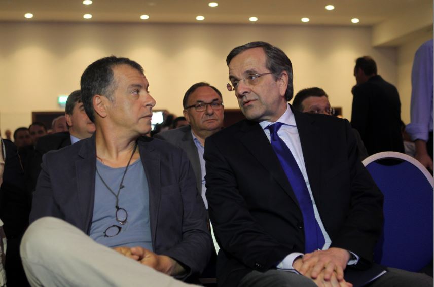 Με τον επικεφαλής του Ποταμιού, Σταύρο Θεοδωράκη, συνομίλησε ο πρόεδρος της Νέας Δημοκρατίας, Αντώνης Σαμαράς, κατά τη διάρκεια του Ετήσιου Τακτικού Συνεδρίου της ΚΕΔΕ που πραγματοποιείται στη Σιθωνία Χαλκιδικής. Όπως φαίνεται και στη φωτογραφία, ο Αντώνης Σαμαράς και ο Σταύρος Θεοδωράκης, κάθονταν δίπλα δίπλα και συνομιλούσαν.