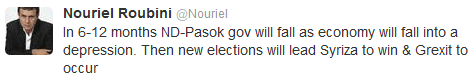 “Η κυβέρνηση Νέας Δημοκρατίας – ΠΑΣΟΚ θα αποτύχει καθώς η οικονομία θα βυθιστεί στην ύφεση” έγραψε στον προσωπικό του λογαριασμό στο Twitter, αμέσως μετά την ανακοίνωση των exit polls, ο γνωστός οικονομολόγος Νουριέλ Ρουμπινί.Εκτίμησε παράλληλα ότι “η Ελλάθα θα προχωρήσει εκ νέου σε εκλογές στις οποίες θα επικρατήσει ο ΣΥΡΙΖΑ με αποτέλεσμα η χώρα να βγει από την Ευρωζώνη”.ΔΕΙΤΕ ΤΙ ΕΓΡΑΨΕ