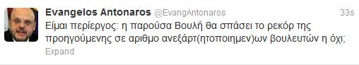 ”Είμαι περίεργος: η παρούσα Βουλή θα σπάσει το ρεκόρ της προηγούμενης σε αριθμό ανεξάρτ(ητοποιημεν)ων βουλευτών ή όχι;”, έγραψε πριν από λίγο στον λογαριασμό του στο twitter.