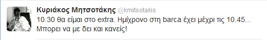 Ο Κυριάκος Μητσοτάκης ανακοίνωσε μέσω twitter ότι θα παρευρεθεί ως καλεσμένος στο τηλεοπτικό κανάλι extra 3 στις 10.30, όταν θα έχει ημίχρονο ο αγώνας ανάμεσα στην Μπαρτσελόνα και στην Τσέλσι για να τον παρακολουθήσουν και αυτοσαρκάζεται:”μπορεί να με δει κανείς”
