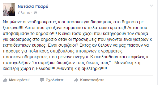 Επίθεση στην Νέα Δημοκρατία και το ΠΑΣΟΚ, εξαπολύει με ανάρτηση στο Facebook, η βουλευτής του ΣΥΡΙΖΑ, στον Έβρο, Νατάσα Γκαρά, με αφορμή το δημοσίευμα εφημερίδας που υποστηρίζει ότι μέλη της οικογένειας Γραμματέα Νεολαίας του ΣΥΡΙΖΑ, διορίστηκαν στο δημόσιο.