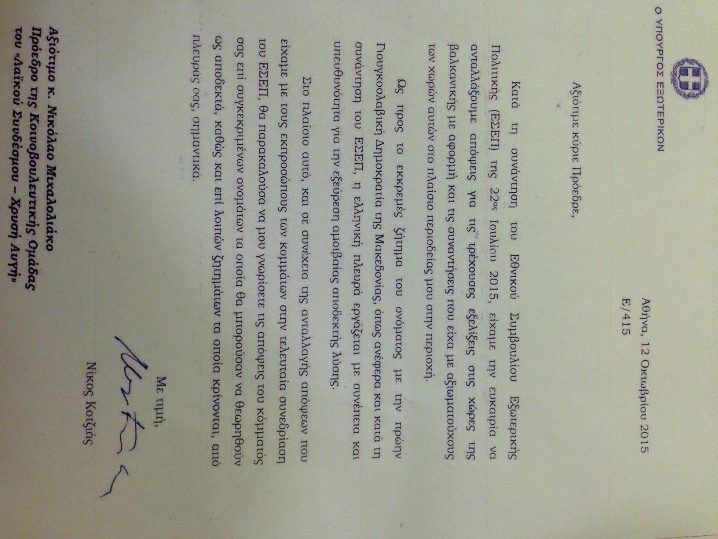 Σύμφωνα με το υπουργείο Εξωτερικών η επιστολή εστάλη προς όλα τα κόμματα ζητώντας τους να αποστείλουν τις απόψεις τους σχετικά με το ζήτημα της ονομασίας της πρώην Γιουγκοσλαβικής Δημοκρατίας της Μακεδονίας. Η αποστολή των σχετικών θέσεων εκ μέρους των κομμάτων εκκρεμεί, σύμφωνα με το ΥΠΕΞ, από τον περασμένο Ιούλιο, όταν συνεδρίασε το Εθνικό Συμβούλιο Εξωτερικής Πολιτικής χωρίς μέχρι σήμερα κάποιο από τα κόμματα να έχει στείλει την απάντησή του.