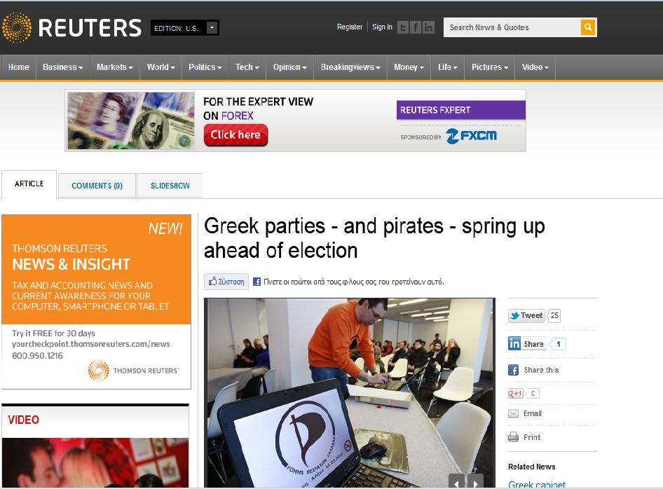 Θέμα στο πρακτορείο Reuters έγινε το “κόμμα των πειρατών” σε ρεπορτάζ με τίτλο “Ελληνικά κόμματα-και πειρατές-ξεπηδούν πριν τις εκλογές”.Όπως αναφέρει το Reuters, πρόκειται για ένα κόμμα, που δεν κλίνει ούτε προς τα αριστερά ούτε προς τα δεξιά, αντίθετα ζητάει διαφάνεια στην κυβέρνηση και μεγαλύτερη ελευθερία στη χρήση του διαδικτύου.”Ονειρεύομαι μια διαφορετική Ελλάδα, με διαφορετικούς πολιτικούς”, είπε ο Δημήτρης Βαγιενάς, 40 χρονών απολυμένος, στην πρώτη συνάντησή των μελών του κόμματος. Το κόμμα αριθμεί μέχρι στιγμής περίπου 650 μέλη και αυτή την εβδομάδα ψήφισαν για το αν θα κατέβουν στις εκλογές.”Ήρθαμε για να μείνουμε”, λέει στο Reuters ο εκπρόσωπος του κόμματος Ανέστης Σαμουρκασίδης, 42 ετών.