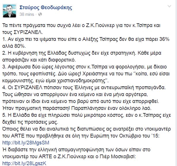 Μέσω του λογαριασμού του στο facebook ο επικεφαλής του Ποταμιού Σταύρος Θεοδωράκης αναφέρθηκε στα «πέντε πράγματα που συχνά λέει ο Ζαν Κλοντ Γιούνκερ για τον κ. Τσίπρα και τους ΣΥΡΙΖΑΝΕΛ».