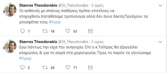 Σε δεύτερη ανάρτηση, ο κ. Θεοδωράκης σχολιάζει σκωπτικά: «Εγώ πάντως την είχα την ανησυχία. Ότι ο κ. Τσίπρας θα εξαγγείλει κληρώσεις & για τη σειρά στα χειρουργεία. Προς το παρόν τη γλυτώσαμε».Δείτε τις αναρτήσεις: