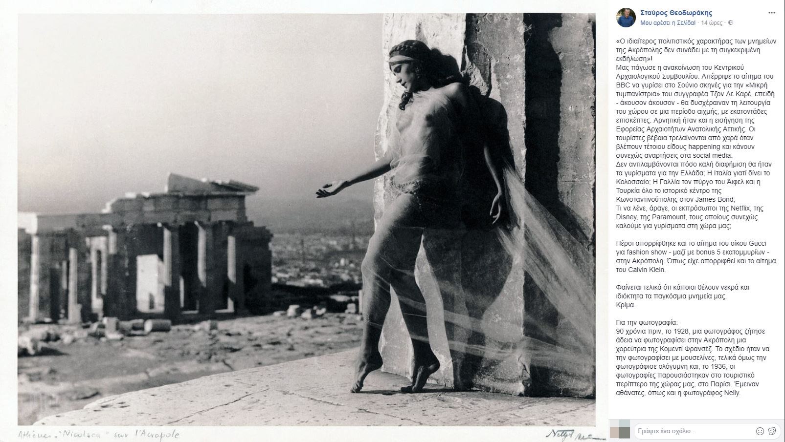 «Φαίνεται τελικά ότι κάποιοι θέλουν νεκρά και ιδιόκτητα τα παγκόσμια μνημεία μας» σχολιάζει σε ανάρτησή του στο Facebook, ο Σταύρος Θεοδωράκης για την άρνηση του Κεντρικού Αρχαιολογικού Συμβουλίου να παραχωρήσει το Σούνιο για γυρίσματα παραγωγής του BBC.