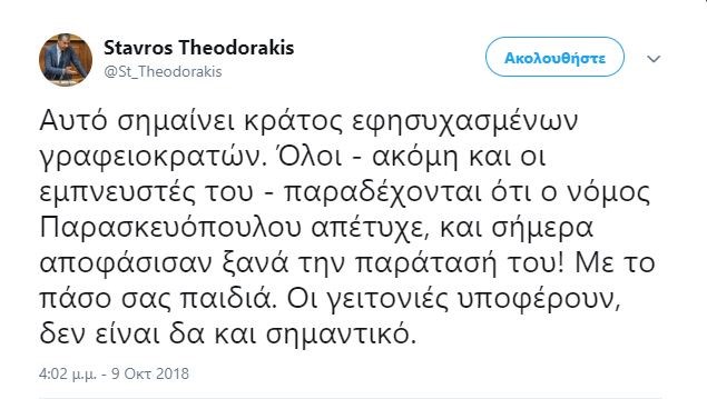 Την απόφαση για παράταση του νόμου Παρασκευόπουλου σχολιάζει με ανάρτησή του στο twitter ο Σταύρος Θεοδωράκης.