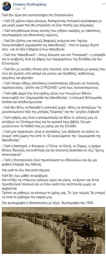 Δώδεκα λόγους για τους οποίους δεν θα βρεθεί στη Θεσσαλονίκη, για το συλλαλητήριο για το Σκοπιανό, δίνει ο Σταύρος Θεοδωράκης σε ανάρτησή του στο Facebook.