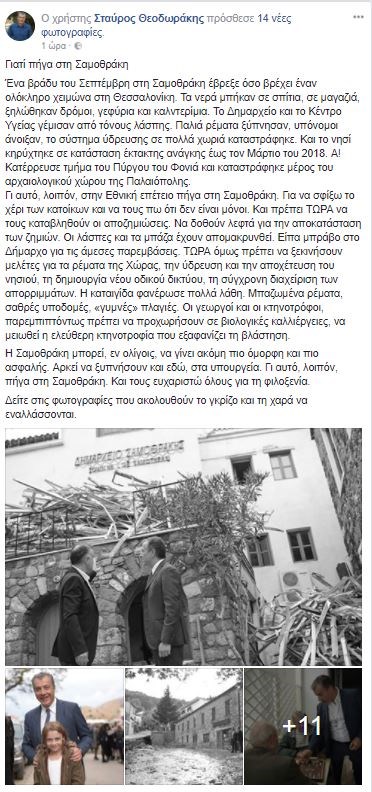 Η Σαμοθράκη μπορεί, εν ολίγοις, να γίνει ακόμη πιο όμορφη και πιο ασφαλής. Αρκεί να ξυπνήσουν και εδώ, στα υπουργεία. Γι αυτό, λοιπόν, πήγα στη Σαμοθράκη. Και τους ευχαριστώ όλους για τη φιλοξενία.Δείτε στις φωτογραφίες που ακολουθούν το γκρίζο και τη χαρά να εναλλάσσονται”.