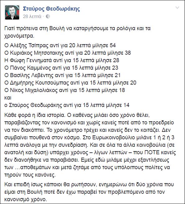 Ο επικεφαλής του Ποταμιού, Σταύρος Θεοδωράκης, με ανάρτησή του στον προσωπικό του λογαριασμό στο facebook, εξηγεί τους λόγους για τους οποίους ζήτησε να καταργηθούν τα ρολόγια στη Βουλή.