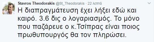Με μια αιχμηρή ανάρτηση στο twitter ο επικεφαλής του Ποταμιού Σταύρος Θεοδωράκης σχολιάζει τα αποτελέσματα του σημερινού Eurogroup στη Μάλτα.«Η διαπραγμάτευση έχει λήξει εδώ και καιρό. 3.6 δισ. ο λογαριασμός» σημειώνει ο κ. Θεοδωράκης και προσθέτει:«Το μόνο που παζάρευε ο κ. Τσίπρας είναι ποιος Πρωθυπουργός θα τον πληρώσει.»