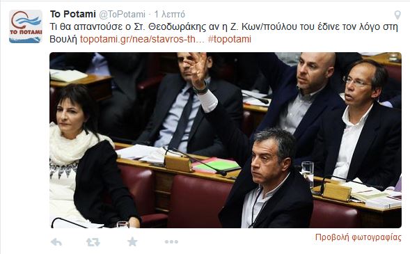 Χαρακτηριστικό είναι και το tweet του Ποταμιού για το περιστατικό το οποίο γράφει: «Τι θα απαντούσε ο Σταύρος Θεοδωράκης, αν η Ζωή Κωνσταντοπούλου του έδινε τον λόγο στη Βουλή», παραθέτοντας την ανακοίνωση του κόμματος.