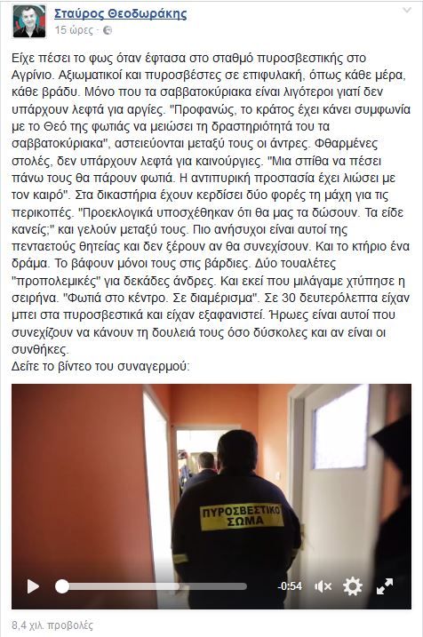 Τον σταθμό της πυροσβεστικής στο Αγρίνιο επισκέφτηκε ο επικεφαλής του Ποταμιού Σταύρος Θεοδωράκης, ανεβάζοντας στον προσωπικό του λογαριασμό στο Facebook, ένα βίντεο στο οποίο καταγράφει τη στιγμή που οι πυροσβέστες καλούνται να επιχειρήσουν σε περιστατικό φωτιάς, τονίζοντας: «Ήρωες είναι αυτοί που συνεχίζουν να κάνουν τη δουλειά τους, όσο δύσκολες και αν είναι οι συνθήκες».