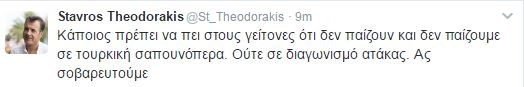Με ανάρτησή του στον λογαριασμό του στο twitter ο επικεφαλής του Ποταμιού Σταύρος Θεοδωράκης σχολιάζει τις νέες τουρκικές προκλήσεις.«Κάποιος πρέπει να πει στους γείτονες ότι δεν παίζουν και δεν παίζουμε σε τουρκική σαπουνόπερα. Ούτε σε διαγωνισμό ατάκας. Ας σοβαρευτούμε.» επισημαίνει ο κ. Θεοδωράκης.