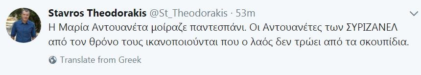 “Η Μαρία Αντουανέτα μοίραζε παντεσπάνι. Οι Αντουανέτες των ΣΥΡΙΖΑΝΕΛ από τον θρόνο τους ικανοποιούνται που ο λαός δεν τρώει από τα σκουπίδια”, αναφέρει ο επικεφαλής του Ποταμιού.