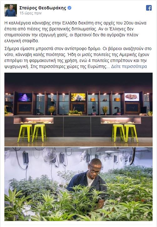 Σε ανάρτησή του στο Facebook, ο κ. Θεοδωράκης σημείωσε ότι «θα έπρεπε να κάνουμε ένα πιο τολμηρό βήμα και να συζητήσουμε χωρίς ταμπού και για την ψυχαγωγική της χρήση από τους ενήλικες. Να μην συνεχίσουμε να κλείνουμε τα μάτια μπροστά στην ανεξέλικτη και παράνομη χρήση χασίς. Η αποποινικοποίηση θα βοηθούσε κυρίως τα παιδιά που πάντα έλκονται από το απαγορευμένο».