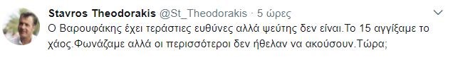 “Ο Βαρουφάκης έχει τεράστιες ευθύνες αλλά ψεύτης δεν είναι” επισημαίνει σε ανάρτησή του στο twitter ο επικεφαλής του Ποταμιού Σταύρος Θεοδωράκης σχολιάζοντας τις αποκαλύψεις του πρώην υπουργού Οικονομικών.