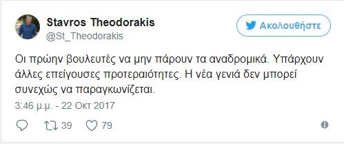 Με αυτόν τρόπο σχολίασε μέσω twitter o Σταύρος Θεοδωράκης τη δικαίωση 100 πρώην βουλευτών στα δικαστήρια για την εξίσωση των αποδοχών τους με αυτές του προέδρου του Αρείου Πάγου, αναδρομικά από το 2009 και μετά.