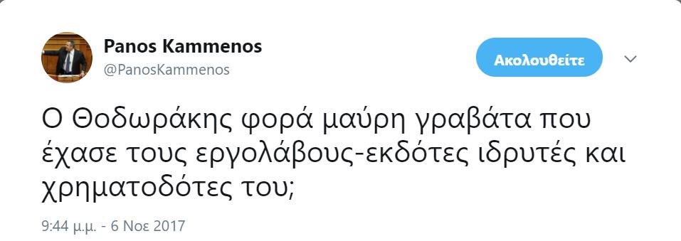 «Ο υπουργός κ. Καμμένος δεν λέει όμως να σταματήσει να λασπολογεί. Έως εδώ λοιπόν! Η χθεσινοβραδινή συκοφαντική επίθεση εναντίον μου μέσω Twitter, αήθης και απρόκλητη, όπως πάντα, ήταν η σταγόνα που ξεχείλισε το ποτήρι. Τις αμέσως επόμενες ημέρες ο δικηγόρος μου θα καταθέσει αγωγή κατά του εξουσιομανούς υπουργού και συγκυβερνήτη του κ. Τσίπρα», τονίζει ο Σταύρος Θεοδωράκης.