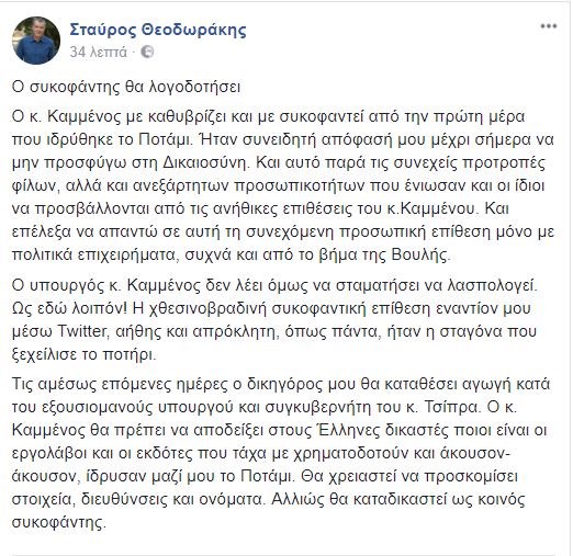 Ο Σταύρος Θεοδωράκης ανακοίνωσε με γραπτή δήλωσή του ότι προσφεύγει στη Δικαιοσύνη κατά του υπουργού Άμυνας Πάνου Καμμένου, υποστηρίζοντας ότι τον καθυβρίζει και τον συκοφαντεί από την πρώτη μέρα που ιδρύθηκε το Ποτάμι.