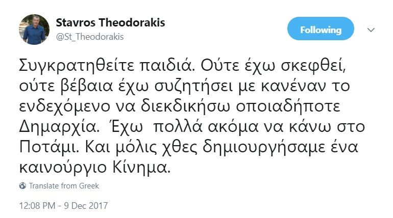 Ο επικεφαλής του Ποταμιού Σταύρος Θεοδωράκη με ανάρτηση που έκανε στον προσωπικό του λογαριασμό στο Twitter διαψεύδει τα σενάρια που τον θέλουν να θέτει υποψηφιότητα για δήμαρχος.