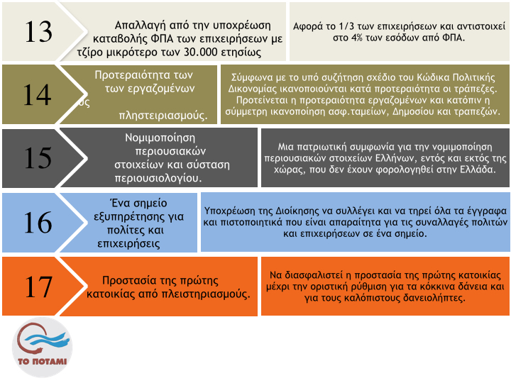 Τα επτά συγκεκριμένα ζητήματα που θέτει απέναντι στην κυβέρνηση και τα άλλα κόμματα το Ποτάμι είναι τα εξής: