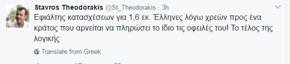 Για «τέλος της λογικής» έκανε λόγο στον προσωπικό του λογαριασμό στο Twitter ο Σταύρος Θεοδωράκης σχολιάζοντας τις κατασχέσεις.«Εφιάλτης κατασχέσεων για 1,6 εκ. Έλληνες λόγω χρεών προς ένα κράτος που αρνείται να πληρώσει το ίδιο τις οφειλές του! Το τέλος της λογικής.», έγραψε ο επικεφαλής του Ποταμιού.Δείτε το tweet του Σταύρου Θεοδωράκη:
