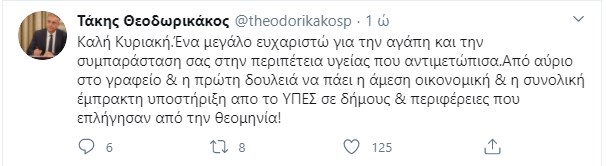 «Καλή Κυριακή. Ένα μεγάλο ευχαριστώ για την αγάπη και την συμπαράσταση σας στην περιπέτεια υγείας που αντιμετώπισα. Από αύριο στο γραφείο & η πρώτη δουλειά να πάει η άμεση οικονομική & η συνολική έμπρακτη υποστήριξη απο το ΥΠΕΣ σε δήμους & περιφέρειες που επλήγησαν από την θεομηνία!» έγραψε.