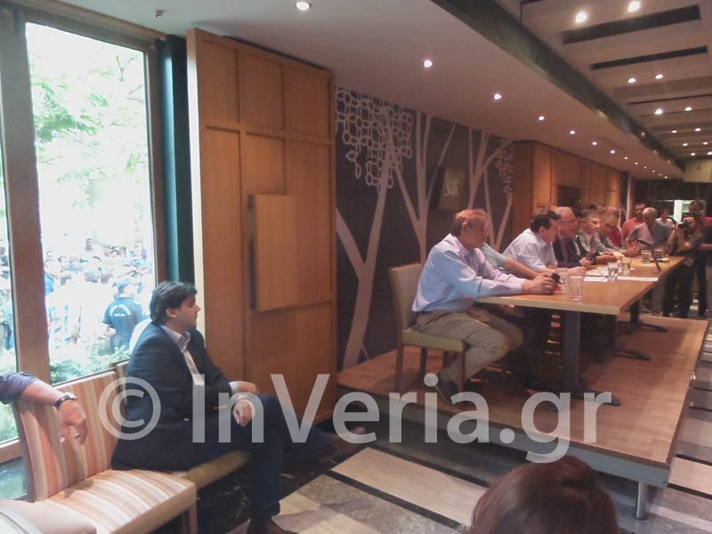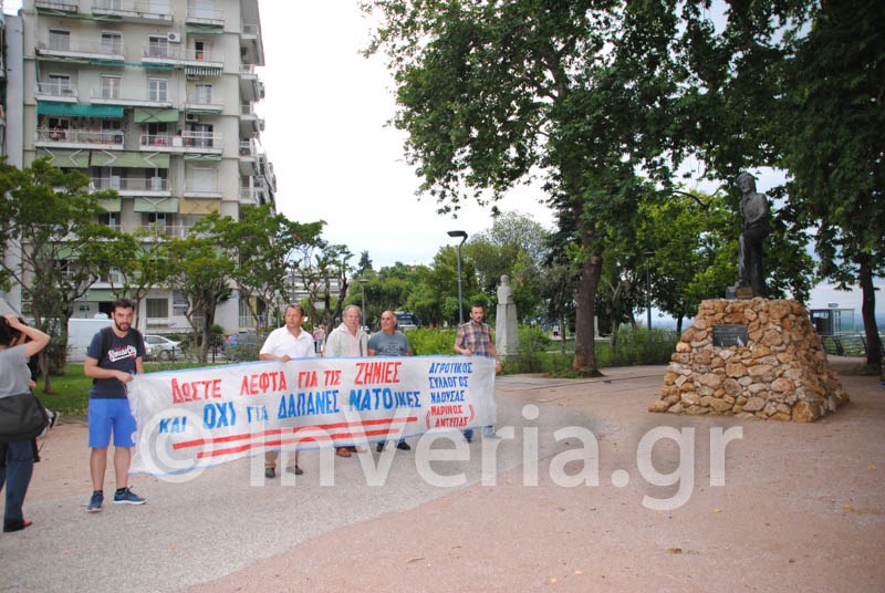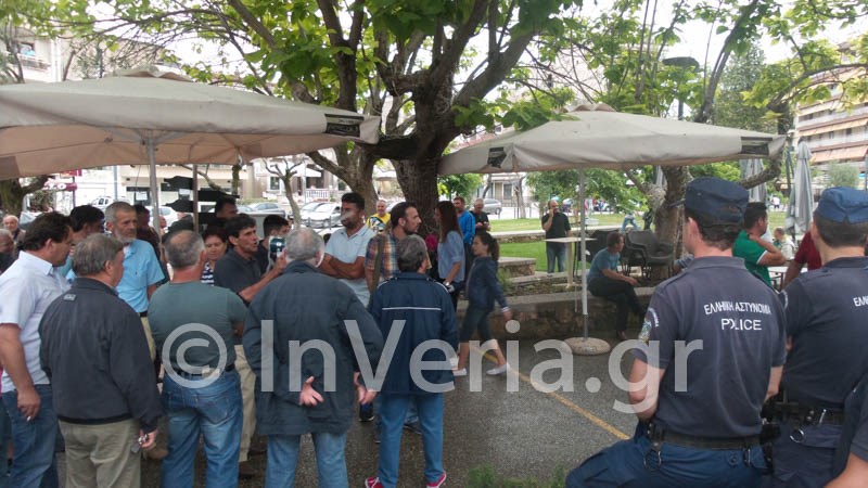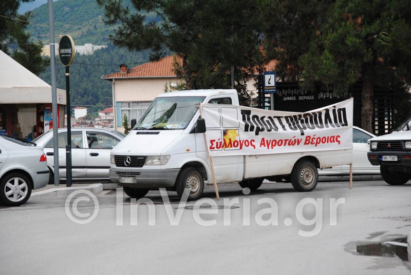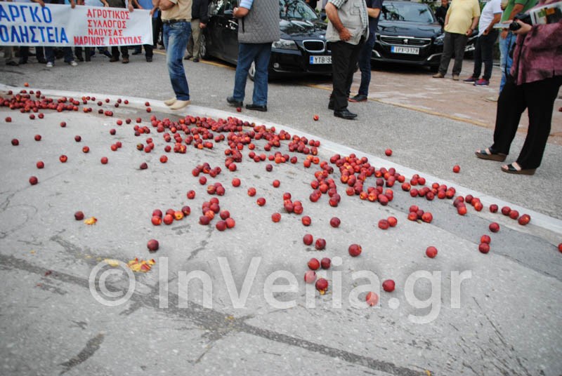 Μέλη του Αγροτικού Συλλόγου Βέροιας, του αγροτικού Συλλόγου «Μαρίνος Αντύπας» αλλά και μέλη του ΠΑΜΕ Ημαθίας, περίμεναν με πανό τον Υπουργό μπροστά στην Εληά για να διαμαρτυρηθούν, να του δώσουν τα «εύσημα» όπως είχαν προαναγγείλει με ανακοινώσεις τους στον Τύπο.