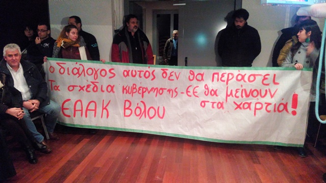 Στη συνέχεια οι συγκεντρωμένοι μπήκαν στην αίθουσα που γινόταν το συνέδριο και άνοιξαν πανό που έγραφε: «Ο διάλογος αυτός δεν θα περάσει, τα σχέδια κυβέρνησης – ΕΕ θα μείνουν στα χαρτιά», με υπογραφή ΕΑΑΚ, χωρίς να δημιουργηθεί ένταση και κάποιο πρόβλημα.