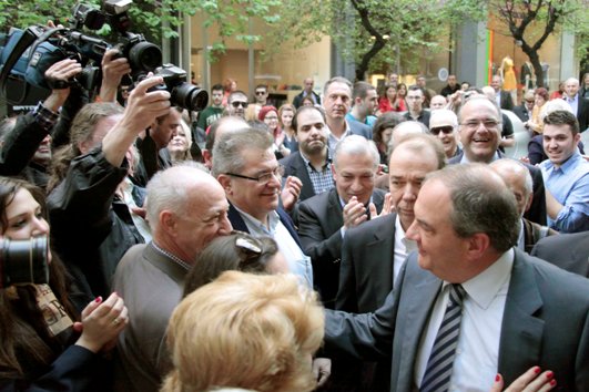 Ο κ. Καραμανλής ανέβηκε στον πέμπτο όροφο όπου συναντήθηκε με τον πρόεδρο της Διοικούσας Επιτροπής της ΝΔ, Δημήτρη Τσάμη και τους υποψήφιους βουλευτές στην Α΄και Β΄εκλογική περιφέρεια Θεσσαλονίκης. Συζήτησαν για την προεκλογική δραστηριότητα και στη σύντομη παρέμβασή του ο κ. Καραμανλής σημείωσε πως “για να κυβερνηθεί ο τόπος πρέπει το βράδυ των εκλογών να υπάρξει νικητής. Δίνουμε τον αγώνα μέχρι την τελευταία στιγμή, με τη ΝΔ και τον Αντώνη Σαμαρά”. Αστειεύτηκε με τον πρόεδρο της Διοικούσας Επιτροπής και του είπε ότι περιμένει από αυτόν οδηγίες για την προεκλογική εκστρατεία, ενώ χαιρέτισε όλους τους υποψήφιους ξεχωριστά και αντάλλαξε λίγες κουβέντες με τον καθένα. Παρών ήταν και ο Παναγιώτης Ψωμιάδης, στον οποίο ο κ. Καραμανλής είπε ότι οι δυο τους ήταν από τους πιο παλιούς στην αίθουσα. Η επίσκεψη του κ. Καραμανλή διήρκεσε 15 λεπτά. Ο Κώστας Καραμανλής βρίσκεται από την Τρίτη το βράδυ στην Θεσσαλονίκη –την εκλογική του περιφέρεια– με σκοπό να βοηθήσει και στην πράξη, σε αυτή την κρίσιμη εκλογική διαδικασία, την ΝΔ και τον Αντώνη Σαμαρά. Η συσπείρωση των “γαλάζιων” ψηφοφόρων είναι ο πρώτος στόχος της ΝΔ και όλοι γνωρίζουν την σημαντική απήχηση που έχει ο πρώην Πρωθυπουργός στην βάση του κόμματος.