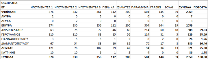 Στις εσωκομματικές εκλογές για την εκλογή Προέδρου του ΠΑΣΟΚ στον Νομό Θεσπρωτίας, πρώτος σε ψήφους αναδείχθηκε ο Νίκος Ανδρουλάκης, με 608 ψήφους και ποσοστό 29.53%.