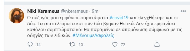 Θετικοί στον κορονοϊό διαγνώστηκαν η Νίκη Κεραμέως και ο σύζυγός της. “Ο σύζυγός μου εμφάνισε συμπτώματα Covid-19 και ελεγχθήκαμε και οι δύο. Τα αποτελέσματα και των δύο βγήκαν θετικά. Δεν έχω εμφανίσει καθόλου συμπτώματα και θα παραμείνω σε απομόνωση σύμφωνα με τις οδηγίες των ειδικών” έγραψε η υπουργός Παιδείας στο Twitter.