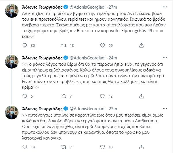 Θετικός στον κορονοϊό βρέθηκε ο Άδωνις Γεωργιάδης, όπως γνωστοποίησε ο ίδιος με ανάρτησή του στο Twitter. Ο υπουργός Ανάπτυξης και Επενδύσεων μπαίνει σε καραντίνα και επισημαίνει μεταξύ άλλων ότι χθες το βράδυ ανέβασε πυρετό και ότι έκανε αμέσως μοριακό τεστ, με το οποίο διαπιστώθηκε ότι είναι θετικός στον ιό.