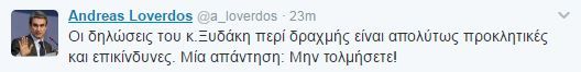 «Οι δηλώσεις του κ. Ξυδάκη περί δραχμής είναι απολύτως προκλητικές και επικίνδυνες. Μία απάντηση: Μην τολμήσετε!» έγραψε ο κ. Λοβέρδος.