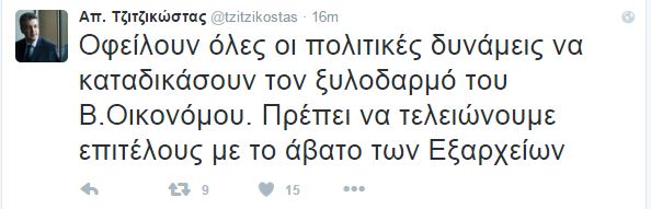 Ο κ. Τζιτζικώστας κάλεσε επίσης όλες τις πολιτικές δυνάμεις “να καταδικάσουν τον ξυλοδαρμό του κ. Οικονόμου.” “Πρέπει να τελειώνουμε επιτέλους με το άβατο των Εξαρχείων” τόνισε.