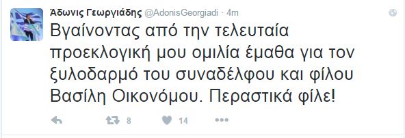 «Βγαίνοντας από την τελευταία προεκλογική μου ομιλία έμαθα για τον ξυλοδαρμό του συναδέλφου και φίλου Βασίλη Οικονόμου. Περαστικά φίλε»