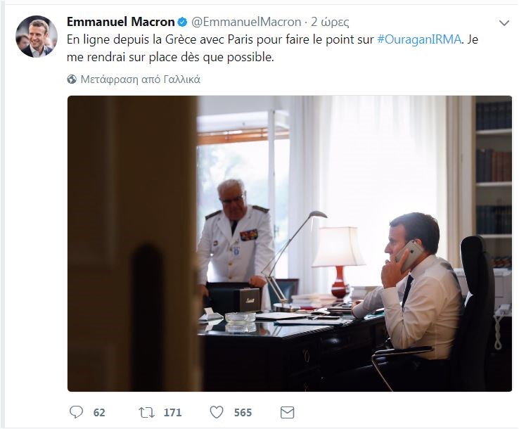 “Βρίσκομαι σε ανοιχτή γραμμή από την Ελλάδα με το Παρίσι, για να κάνω τον απολογισμό σχετικά με τον τυφώνα Ίρμα. Θα είμαι εκεί το συντομότερο δυνατό”, έγραψε χαρακτηριστικά.